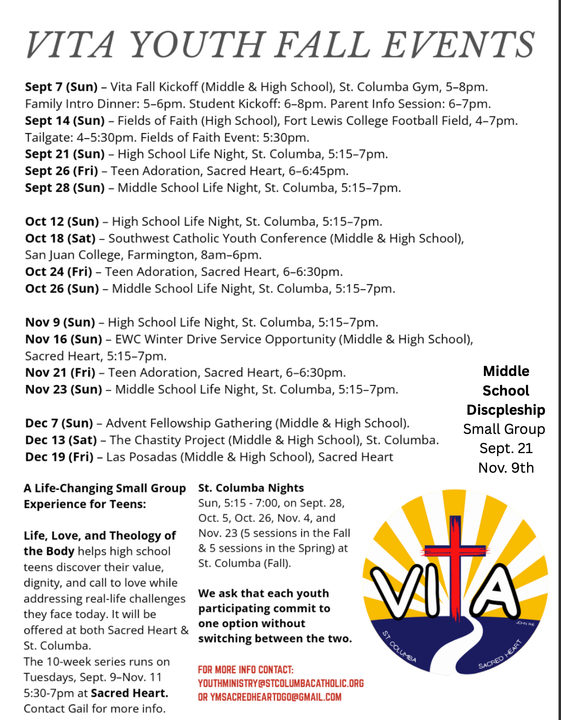 Join us for our Family of Faith & Vita Kids Kickoff Meeting Saturday, September 7th at 9:00 am in the Parish Center. All families are welcome! Discover how to live as disciples of Christ while strengthening family bonds and building lasting friendships with other Catholic families.
